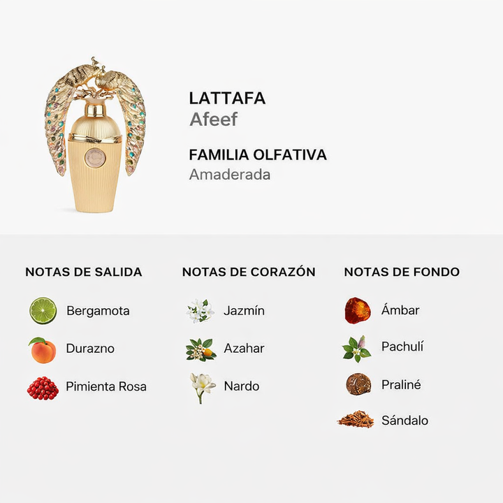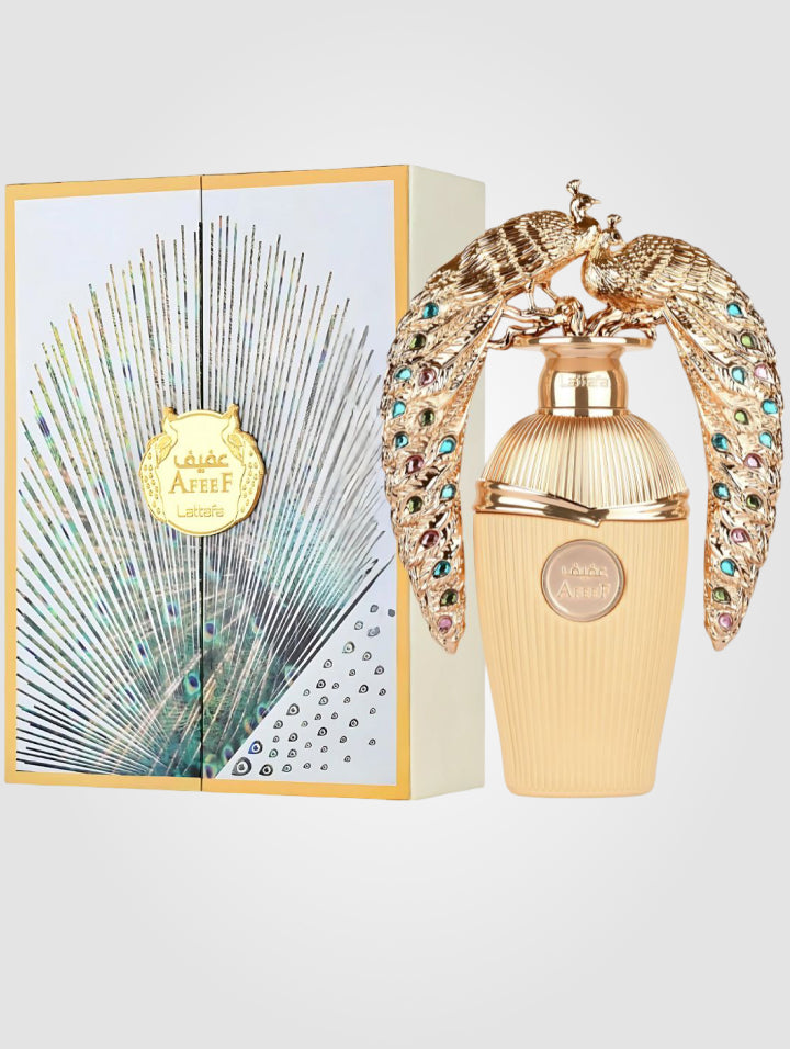 Descripción: Descubre Lattafa Afeef, una fragancia unisex sofisticada y envolvente que combina notas frutales y florales con un corazón cálido y una base amaderada elegante.