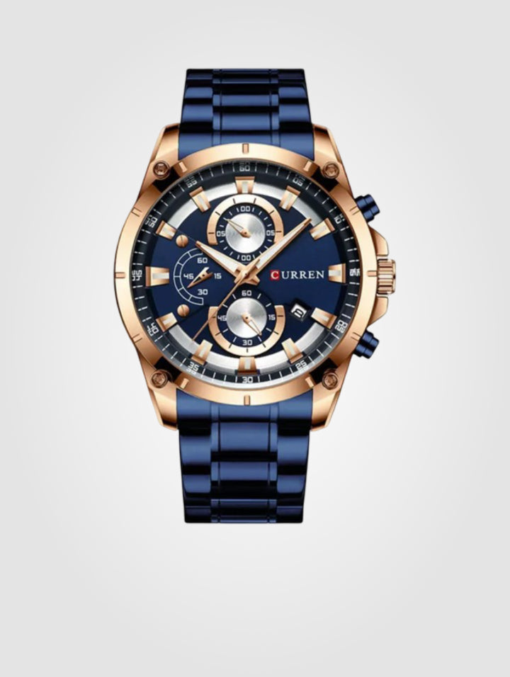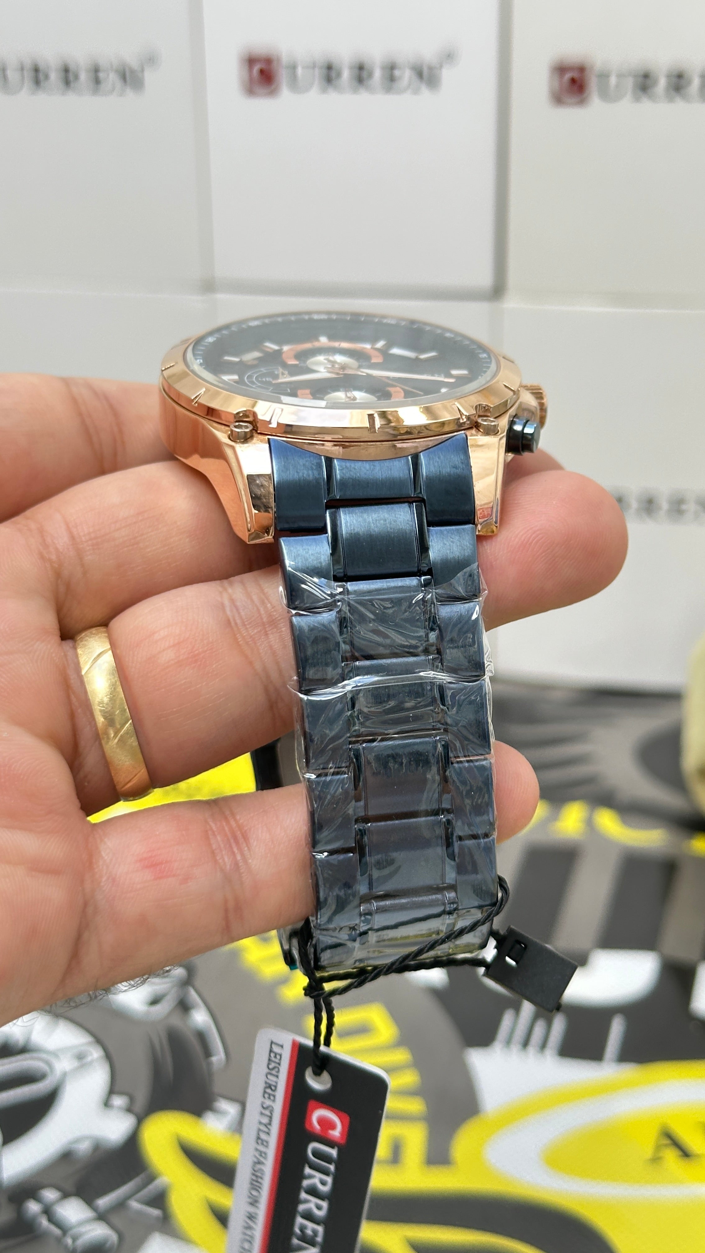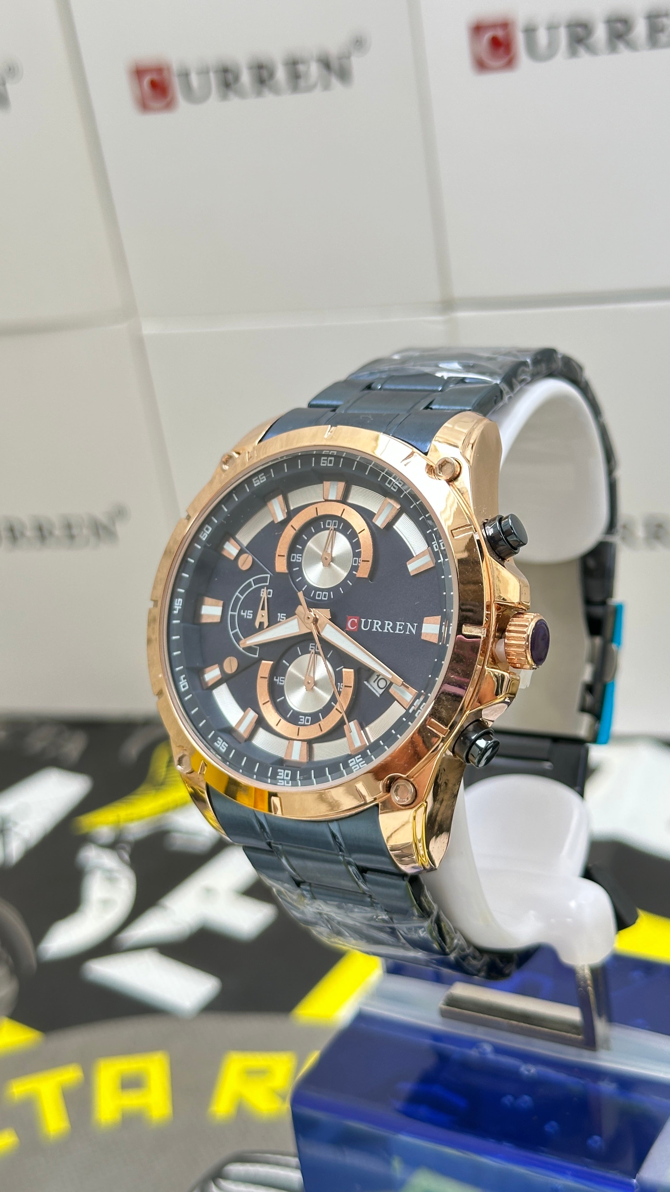 Reloj Curren 8360 para hombre, diseño elegante con caja dorada de 50 mm, cronos especiales y calendario funcional. Correa de acero inoxidable y resistencia al agua de 30 metros.