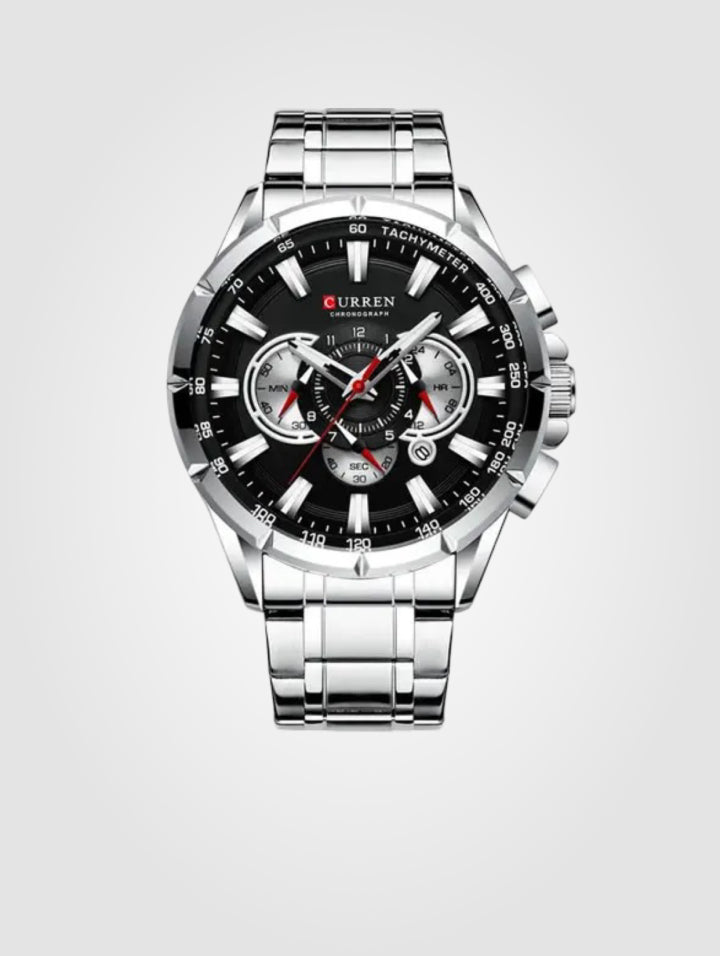 Reloj Curren 8363 para hombre, diseño elegante con caja plateada de 48 mm con el fondo negro, cronógrafos especiales y calendario funcional. Correa de acero inoxidable y resistencia al agua de 30 metros.