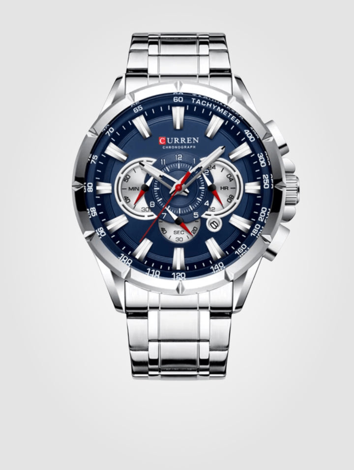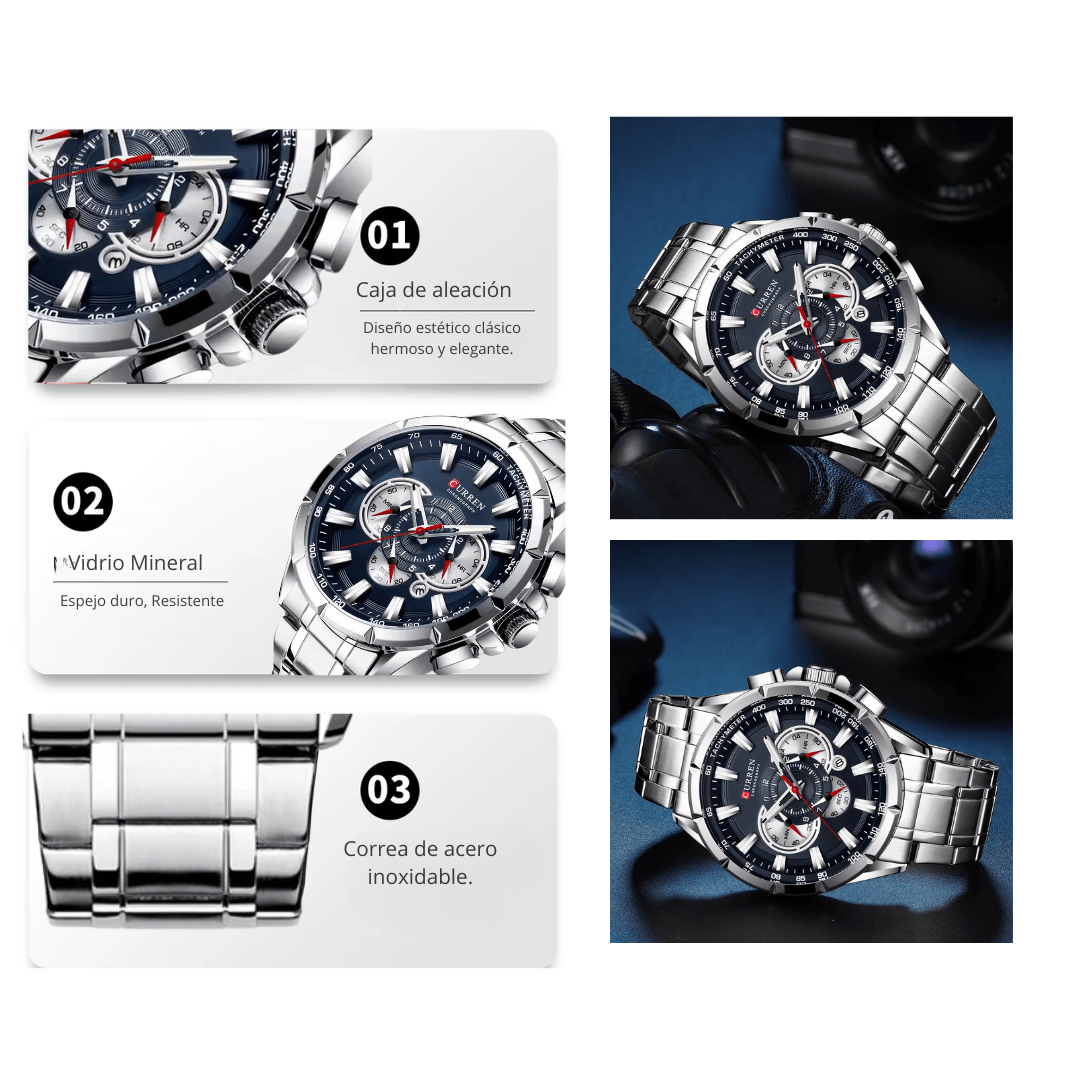 Reloj Curren 8363 para hombre, diseño elegante con caja plateada de 48 mm con el fondo negro, cronógrafos especiales y calendario funcional. Correa de acero inoxidable y resistencia al agua de 30 metros.