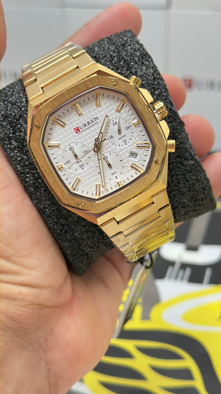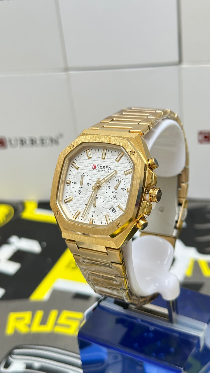 Reloj Curren 8459 para hombre , elegante y resistente en diseño dorado. Caja de 40 mm, correa de acero inoxidable, cronógrafos y calendario funcionales, con resistencia al agua de 30 metros. Ideal para uso diario con estilo.