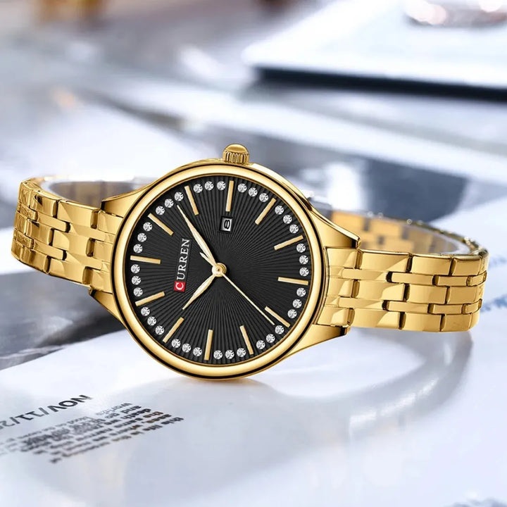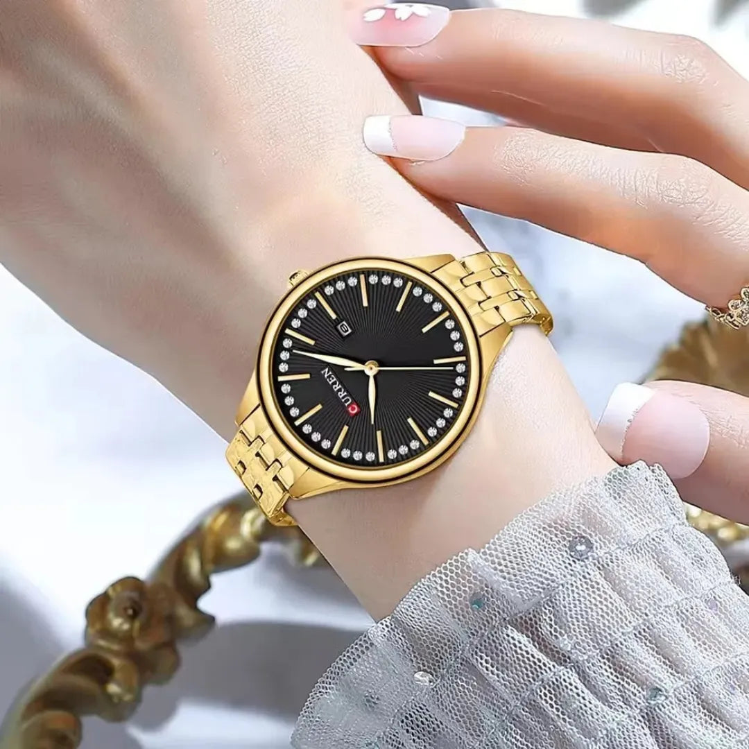 Reloj Curren 9099 para mujer, diseño elegante y moderno con números romanos, correa en acero inoxidable y calendario completo. Ideal para uso diario con estilo y funcionalidad.