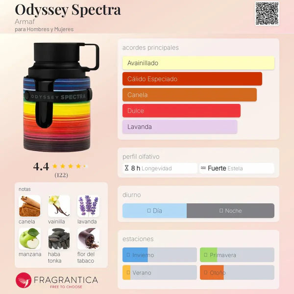 Descripción: Descubre Armaf Odyssey Spectra EDP, una fragancia unisex cálida y sofisticada que combina notas especiadas, frutales y florales con un fondo profundo y envolvente.