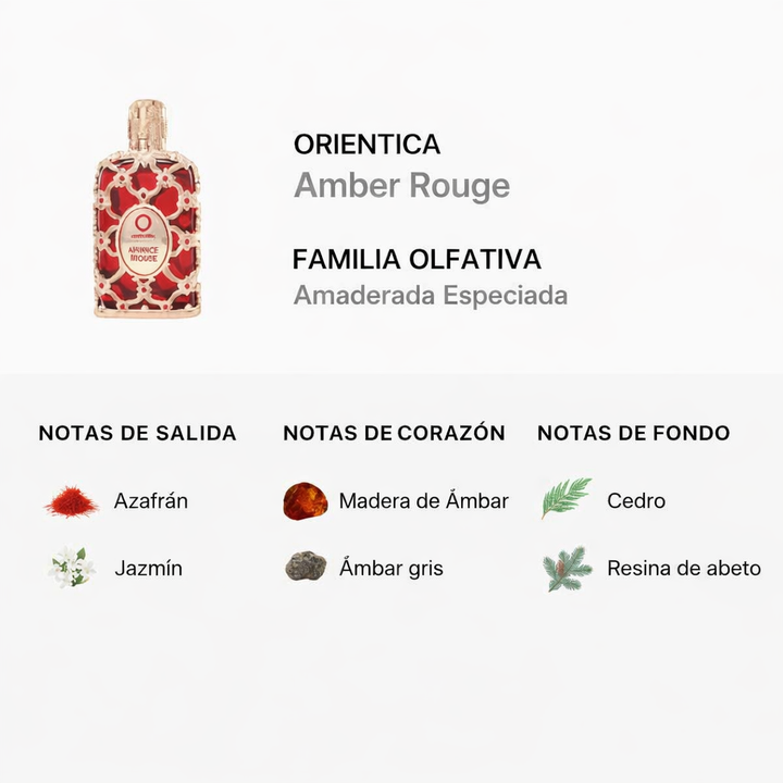 Descripción: Descubre Orientica Amber Rouge, una fragancia unisex cálida y envolvente que combina notas especiadas con acordes amaderados y sensuales.