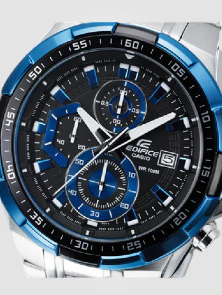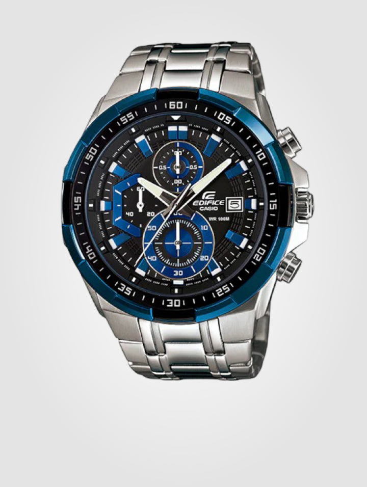 El modelo Casio EFV-539D-1A2V destaca por su diseño elegante, con un llamativo bisel azul y una correa de acero inoxidable en tono plateado, inspirado en los deportes de motor para un look moderno y atrevido. Su cristal mineral y cierre de seguridad garantiza durabilidad, mientras que su resistencia al agua de 100 metros lo hace perfecto para actividades diarias y acuáticas ligeras.