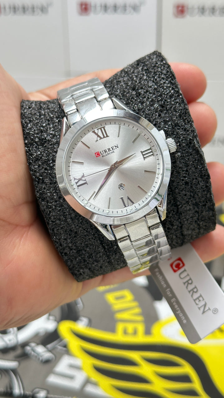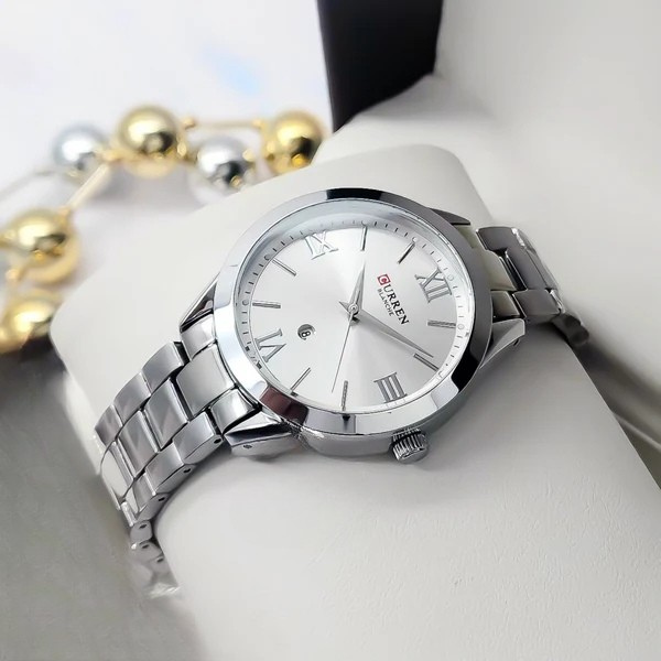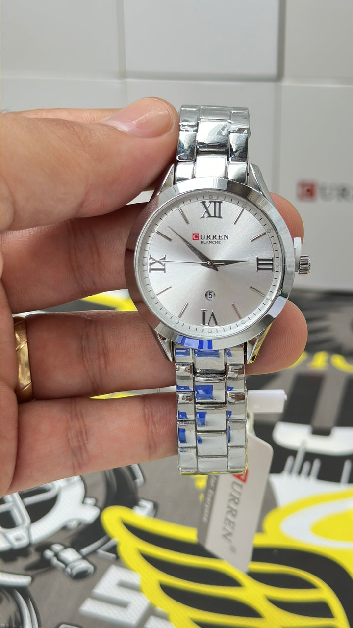 Reloj Curren 9088 para mujer, diseño elegante y moderno con números romanos, correa en acero inoxidable y calendario completo. Ideal para uso diario con estilo y funcionalidad.