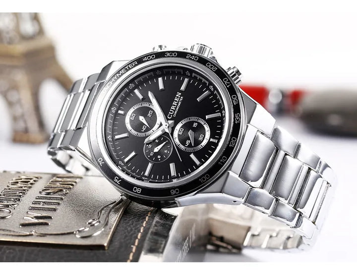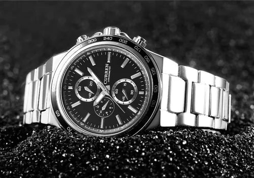 Reloj Curren 8011 para hombre, diseño elegante con caja de 42 mm, cronometros funcionales. Correa de acero inoxidable y resistencia al agua de 30 metros.
