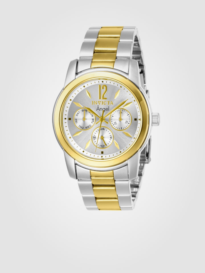 - El Invicta Angel 11735 es una pieza exclusiva que combina elegancia y funcionalidad, diseñada para la mujer sofisticada. Su acabado dorado con plata le otorga un brillo distintivo, mientras que sus cronógrafos elegantes añaden un toque de lujo y precisión.