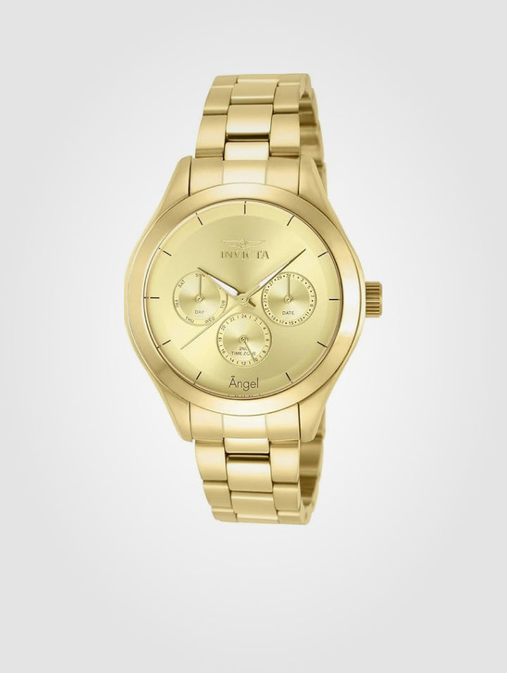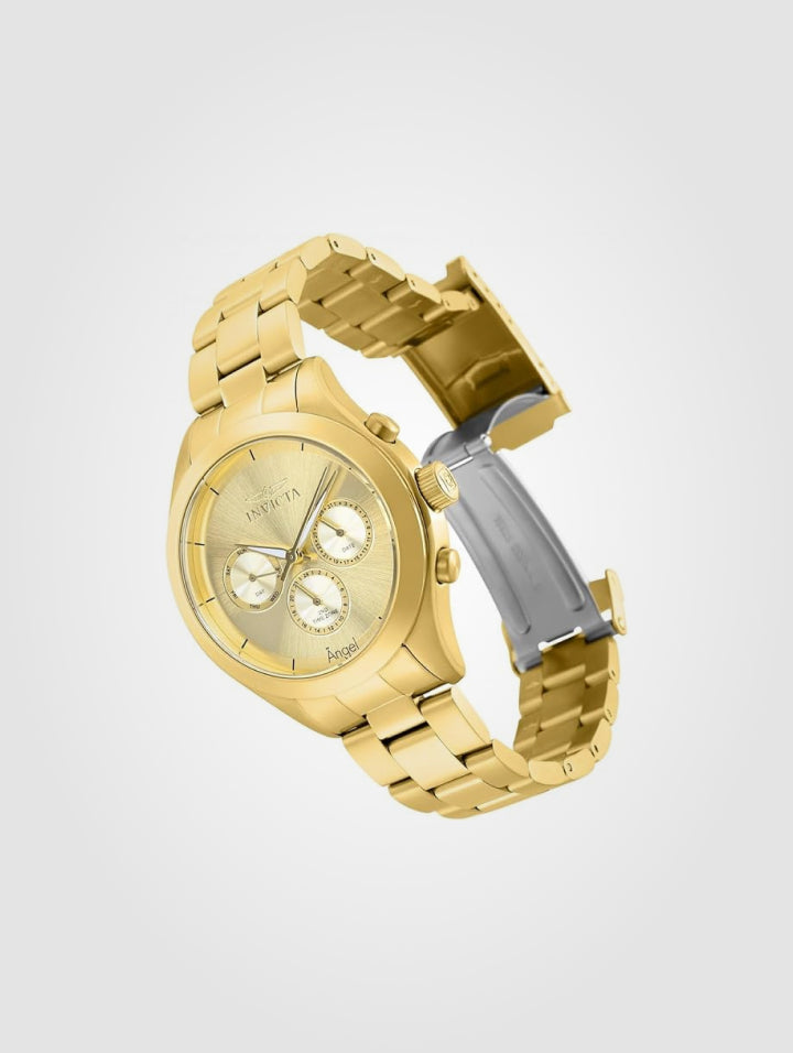 - El Invicta Angel 12466 es la combinación perfecta de elegancia y sofisticación para la mujer moderna. Su diseño en color dorado le otorga un brillo exclusivo, ideal para quienes buscan un reloj refinado y versátil que complemente cualquier look.