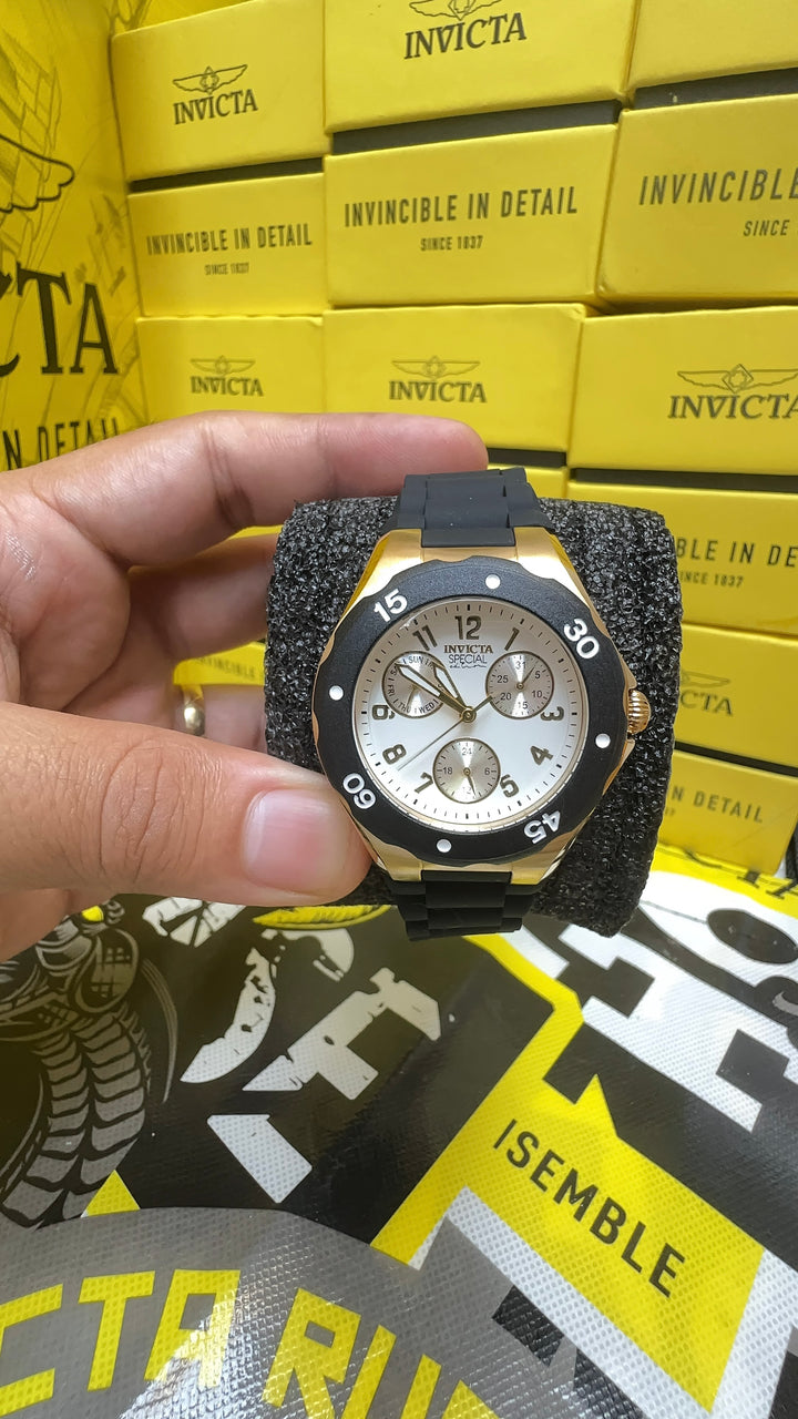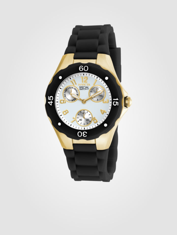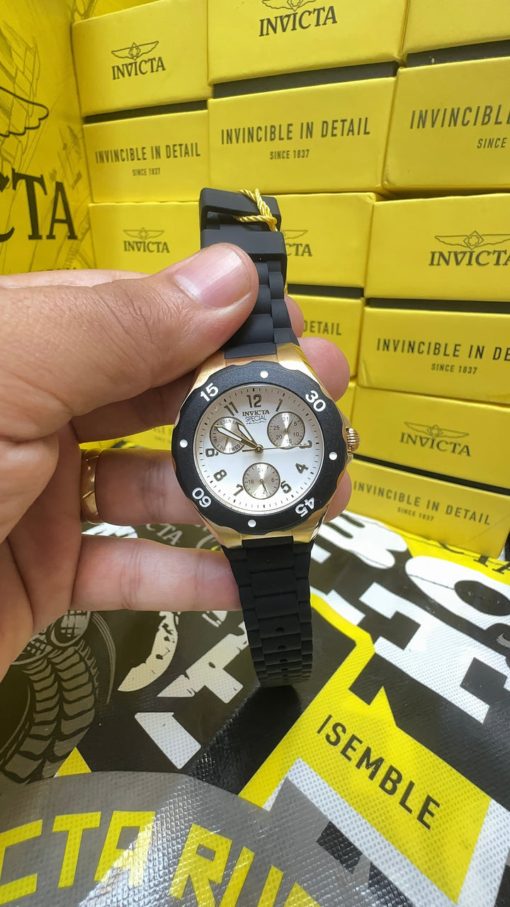 - El Invicta Deportivo para dama es la combinación perfecta de estilo y funcionalidad, diseñado para mujeres que buscan un reloj versátil con un toque de lujo. Su pulso de silicona negra brinda comodidad y resistencia, mientras que su caja de acero inoxidable dorado y dial blanco crean un contraste elegante y sofisticado.