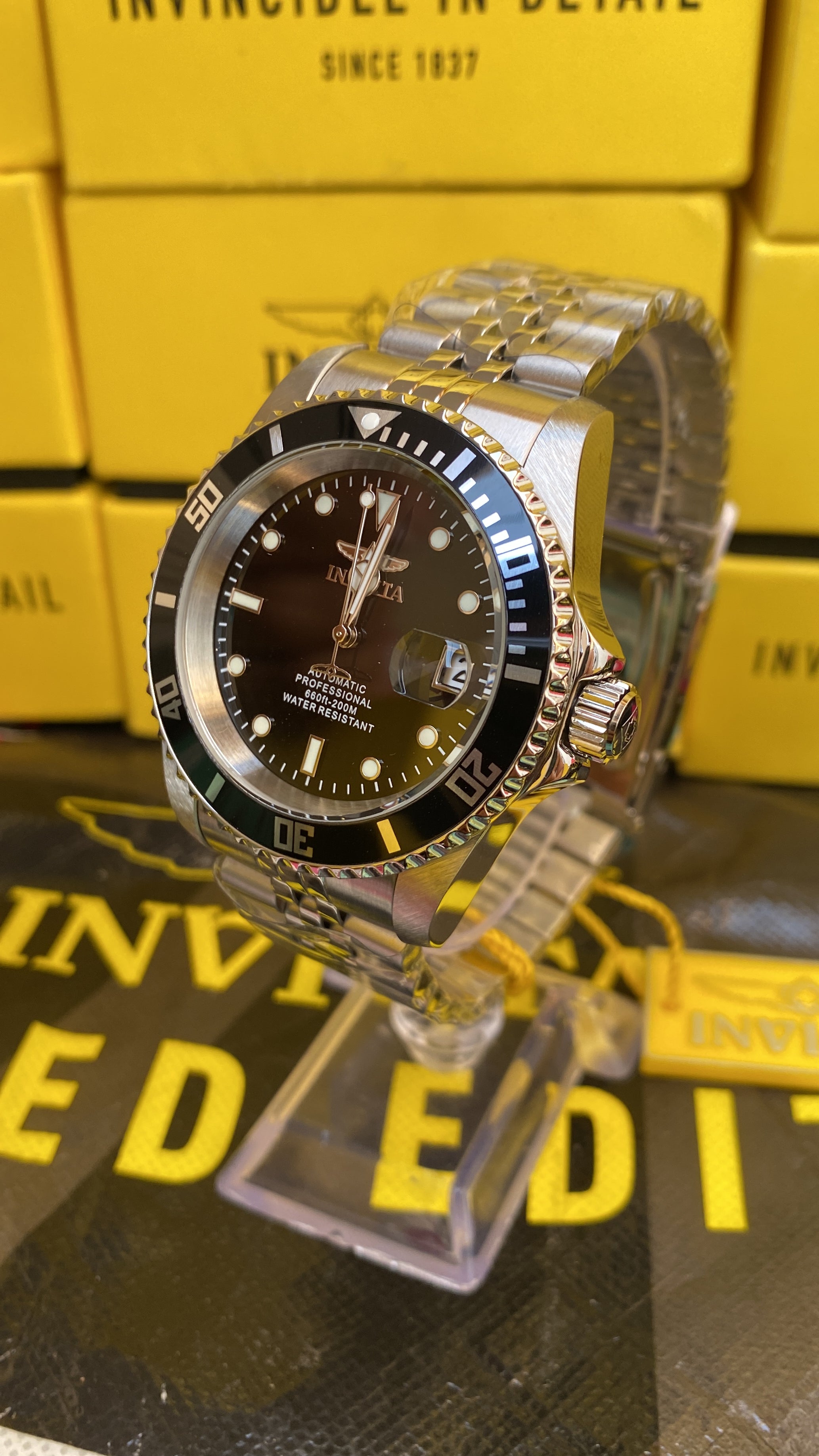 - Descubre la excelencia del Reloj Invicta Pro Diver 30091. Con un diseño sofisticado en acero plateado y esfera negra, este modelo combina estilo clásico con la precisión de una maquinaria automática, ideal para los verdaderos amantes de la relojería.