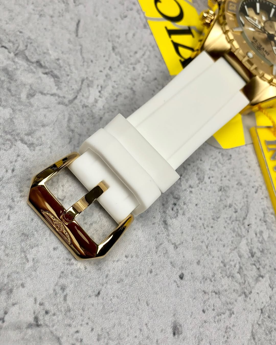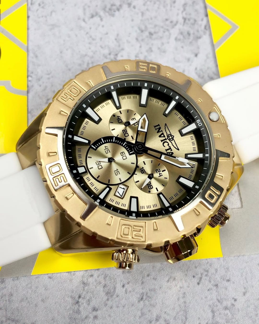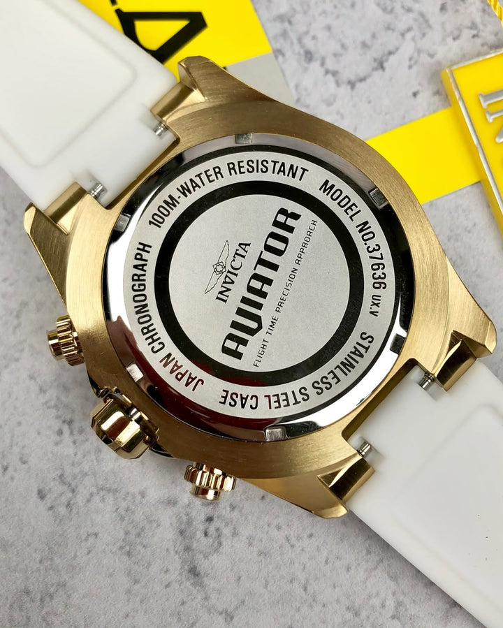 - Descubre la fuerza y el carácter del Reloj Invicta Aviator 37636. Con un diseño imponente, con un pulso blanco y una esfera dorada con detalles en negro dan un equilibrio perfecto entre elegancia y deportividad.