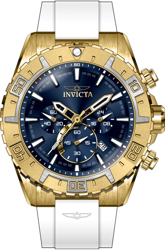 Descubre la fuerza y el carácter del Reloj Invicta Aviator Con un diseño imponente, combina una esfera azul con bisel dorado y con un pulso blanco resistente, logrando un equilibrio perfecto entre elegancia y deportividad.