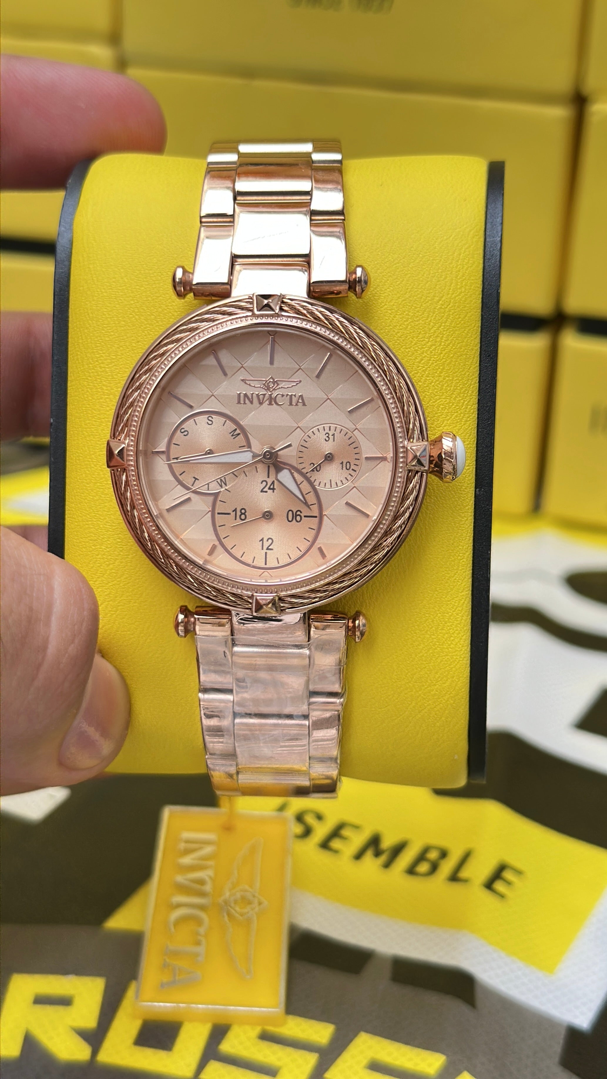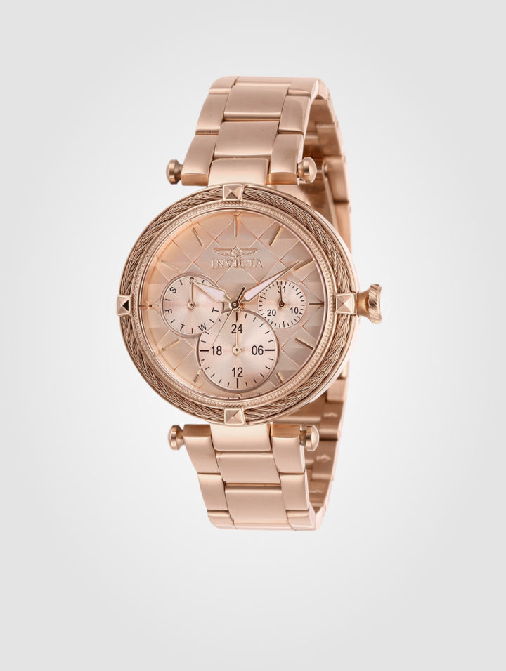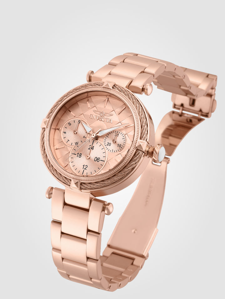 - El Invicta Bolt destaca por su diseño en oro rosa, movimiento de cuarzo preciso y cristal Flame Fusion. Su correa y caja de acero inoxidable lo hacen elegante y resistente, con un bisel tipo cuerda y resistencia al agua de hasta 100 metros.