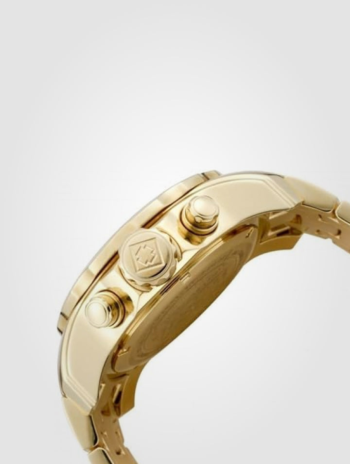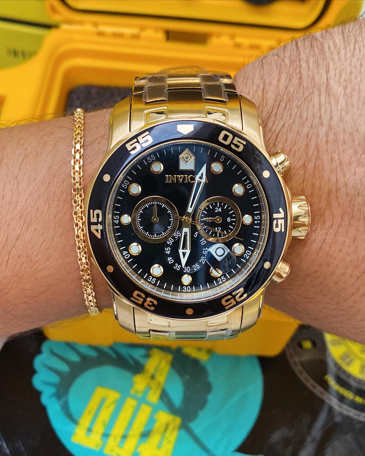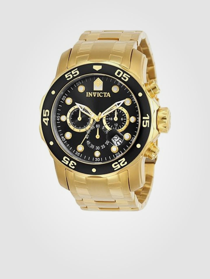 - El Invicta Pro Diver 0072 destaca por su elegante combinación de acabado dorado y dial negro, brindando un estilo sofisticado y llamativo. Su imponente caja de 48 mm y su correa de acero inoxidable dorado le otorgan una presencia inigualable, ideal para quienes buscan lujo y carácter en un solo reloj.