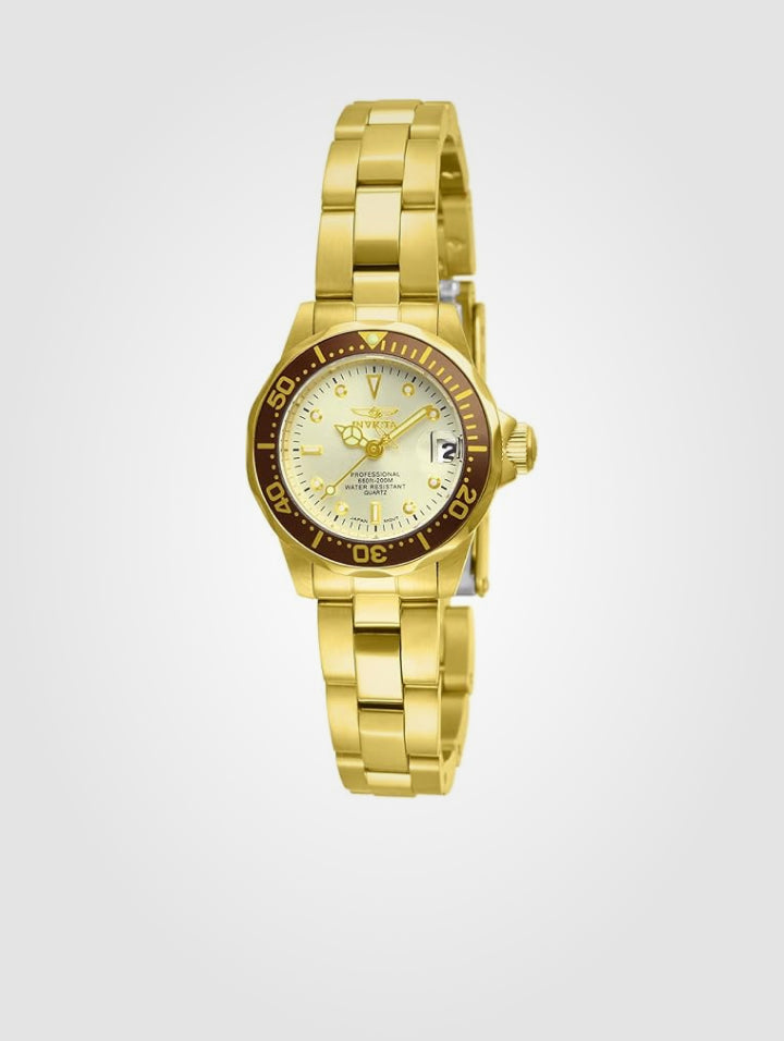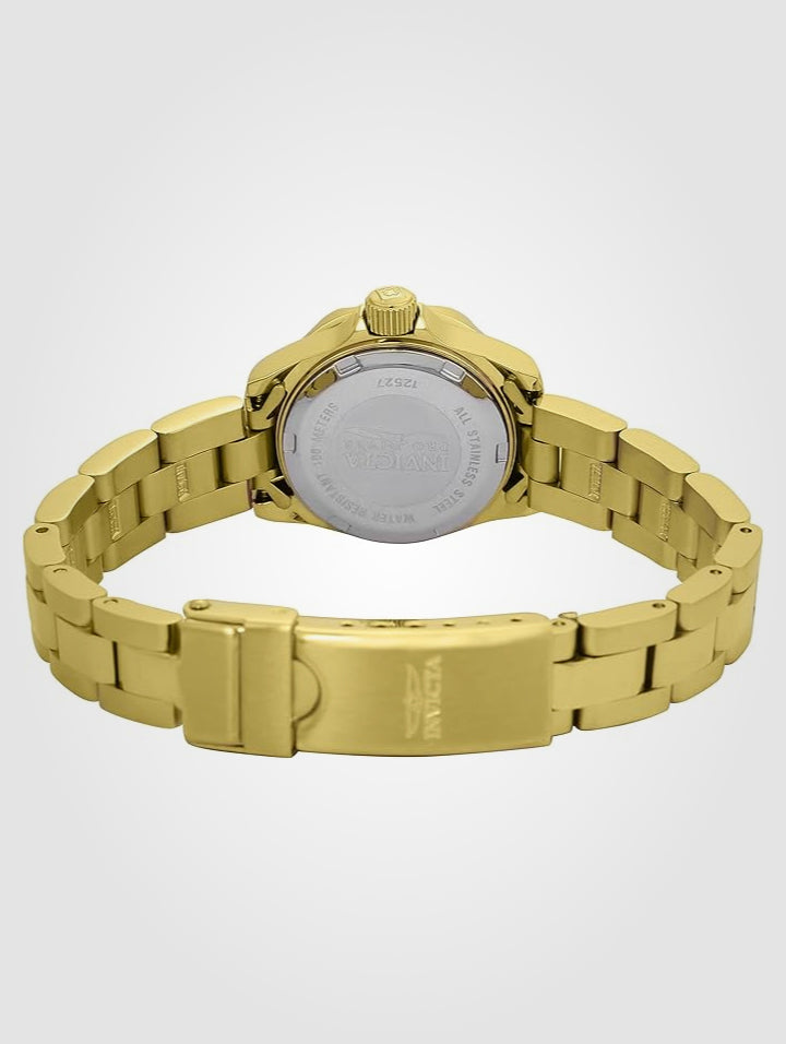 - El Invicta Pro Diver 12527 es la combinación perfecta de elegancia y diseño delgado, ideal para quienes buscan un reloj fino y sofisticado. Su estructura en acero inoxidable dorado junto con su dial blanco le otorgan un estilo atemporal y versátil, perfecto para cualquier ocasión.