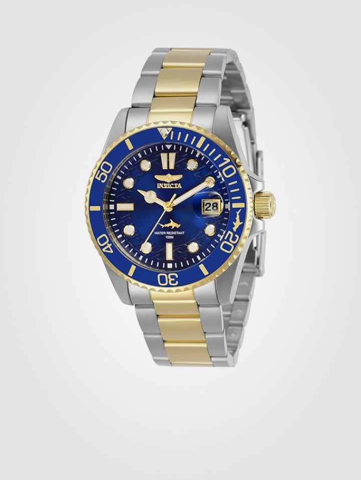 - El Invicta Pro Diver Bicolor con esfera azul es la combinación perfecta de elegancia y deportividad, diseñado para la mujer moderna que busca un reloj versátil y sofisticado. Su acabado en acero inoxidable bicolor (plateado y dorado) junto con su esfera azul vibrante crea un contraste refinado y llamativo.