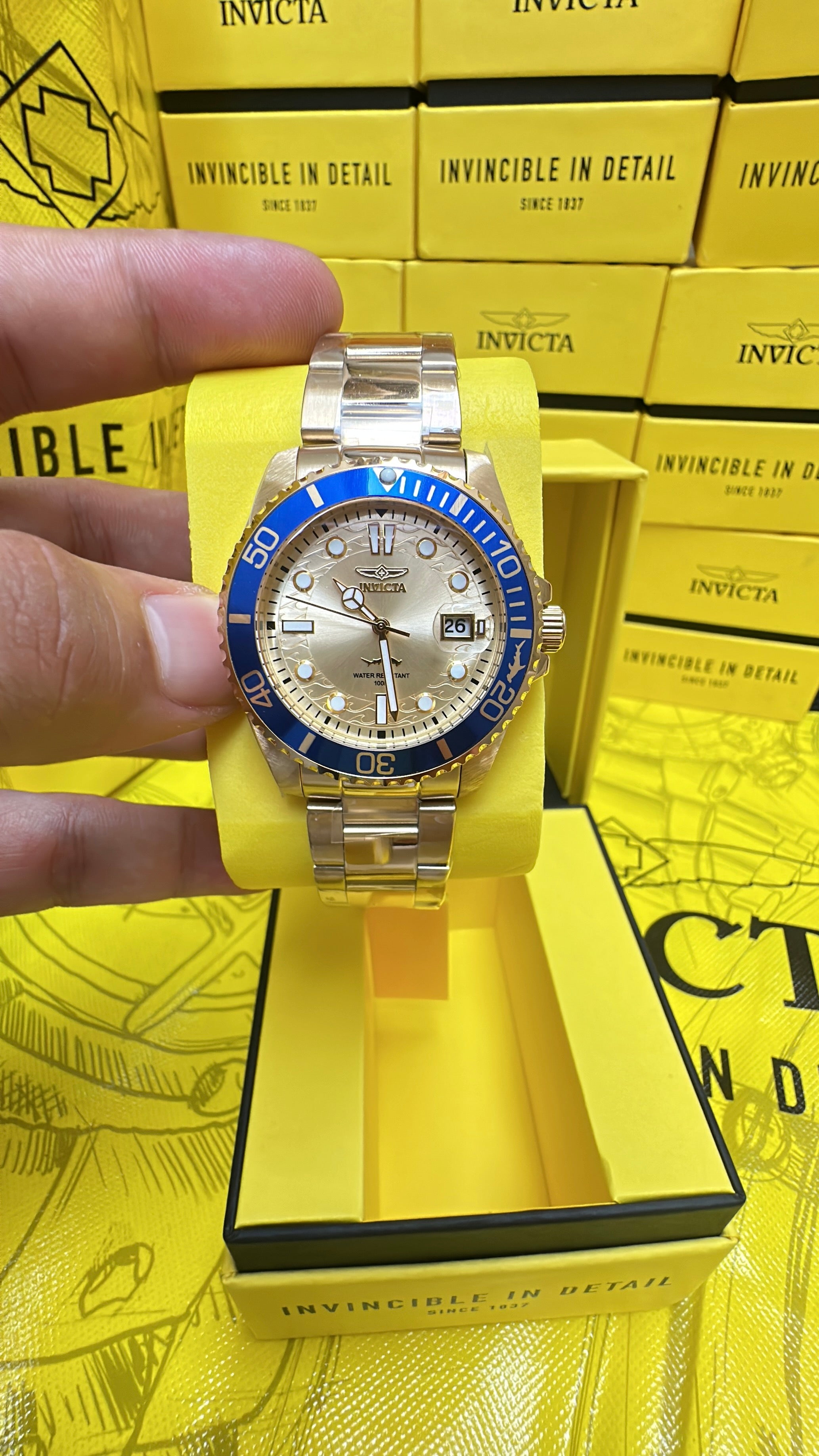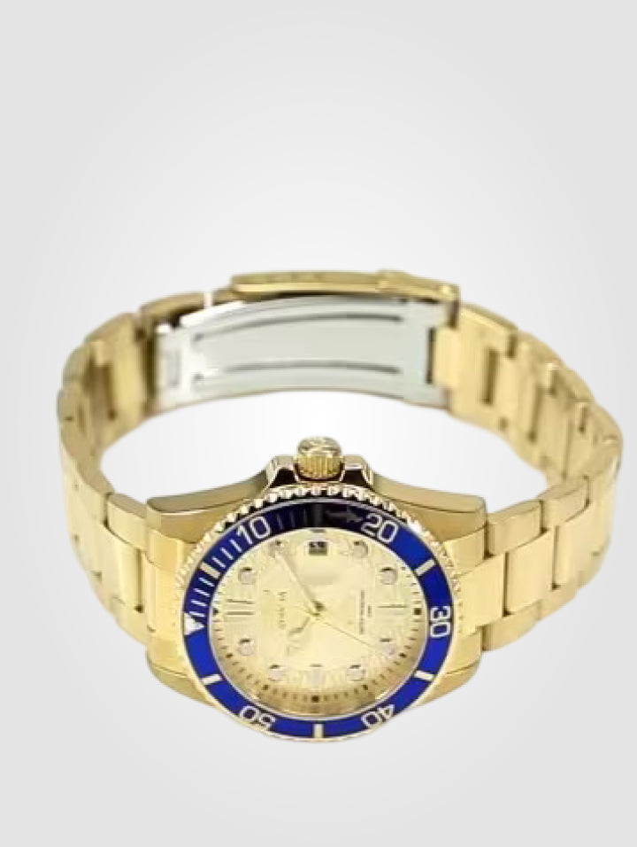 - Color del dial: Dorado con bisel azul.