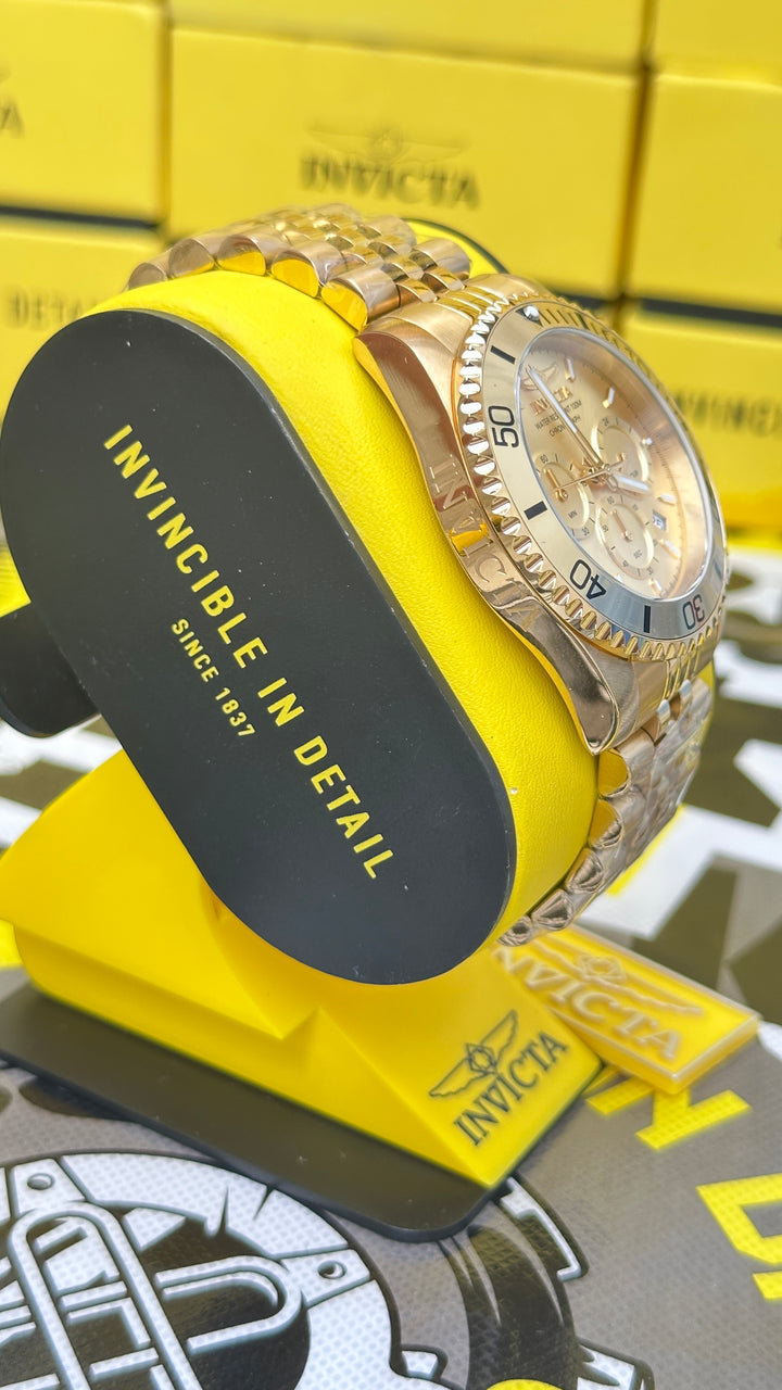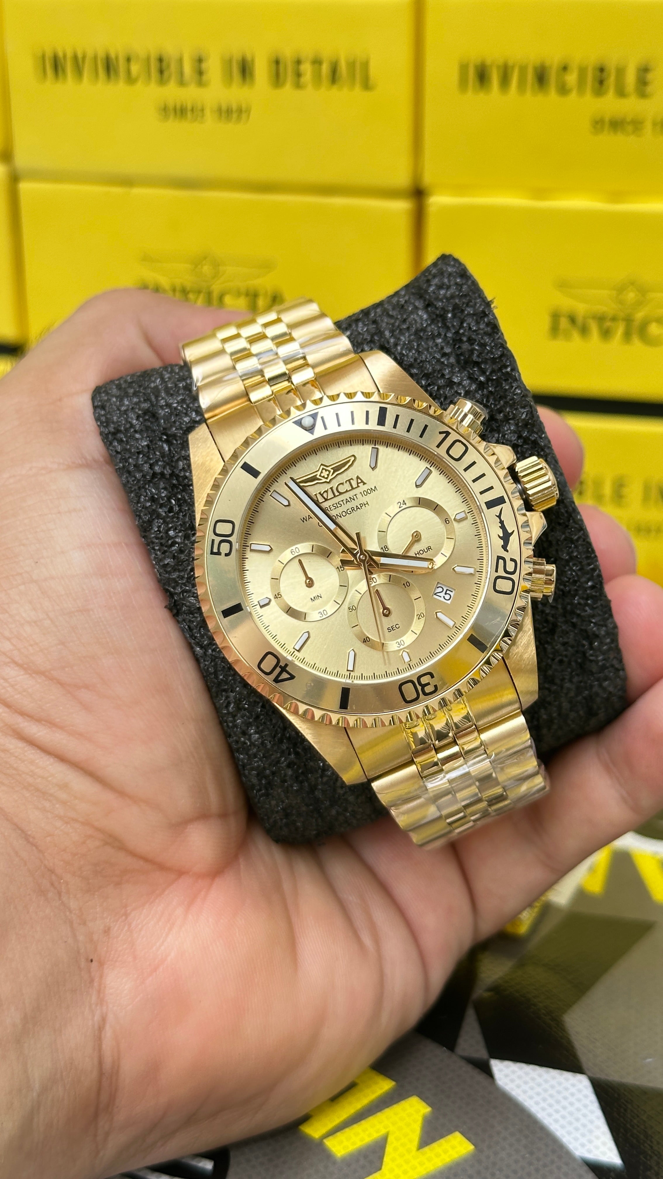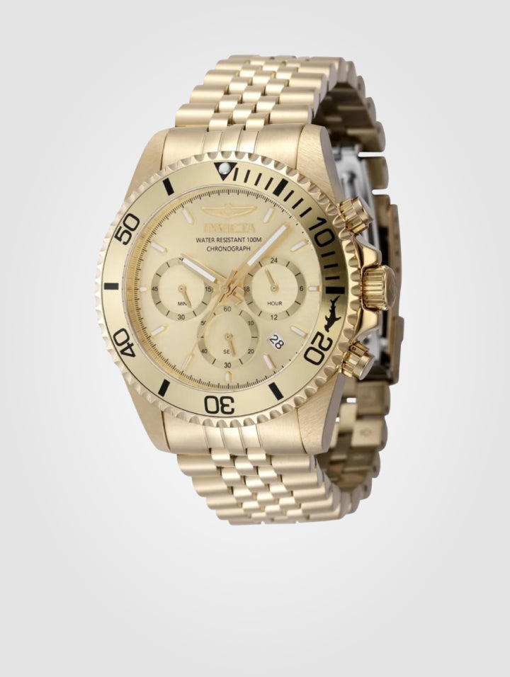 El Invicta Pro Diver 48382 es un reloj que destaca por su elegancia y distinción. Su construcción en acero inoxidable completamente dorado le otorga un acabado refinado y sofisticado, mientras que su esfera dorada crea una armonía perfecta que transmite lujo y estilo atemporal.