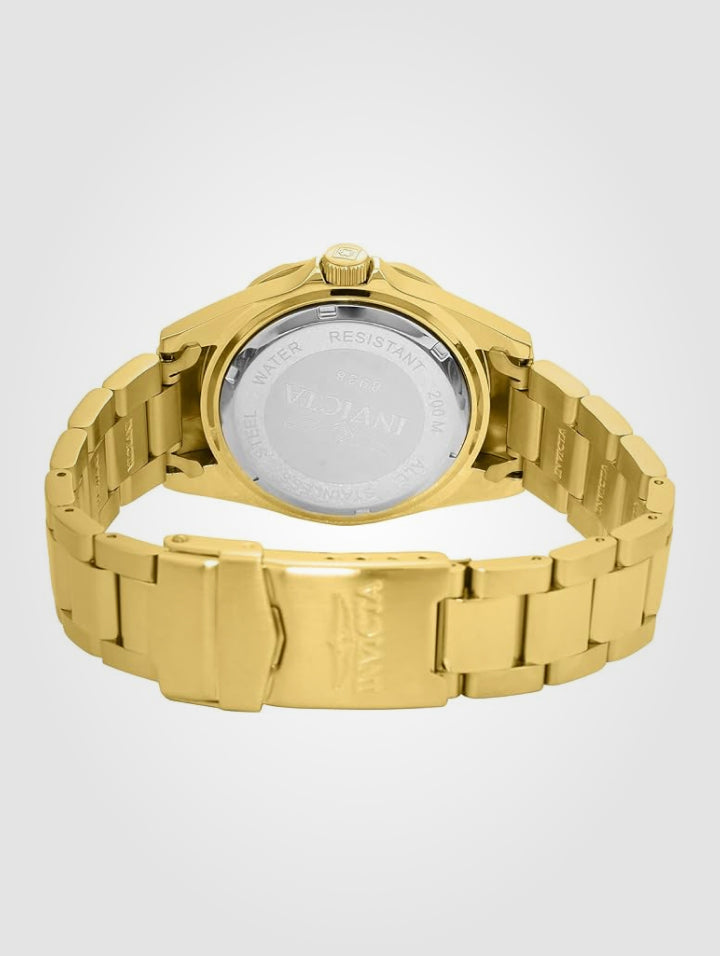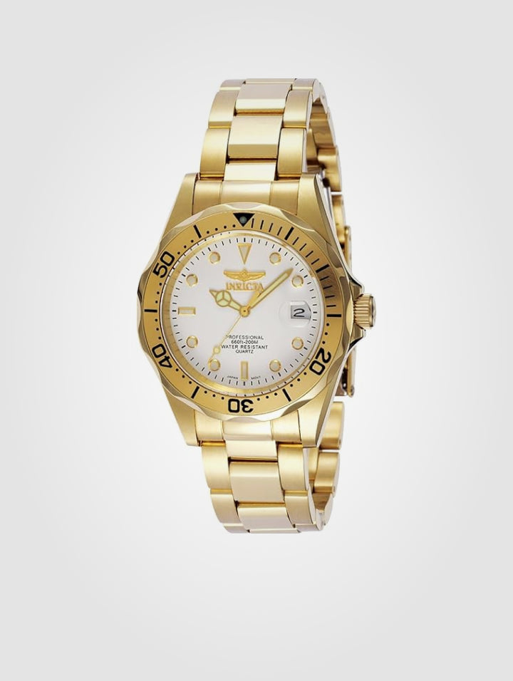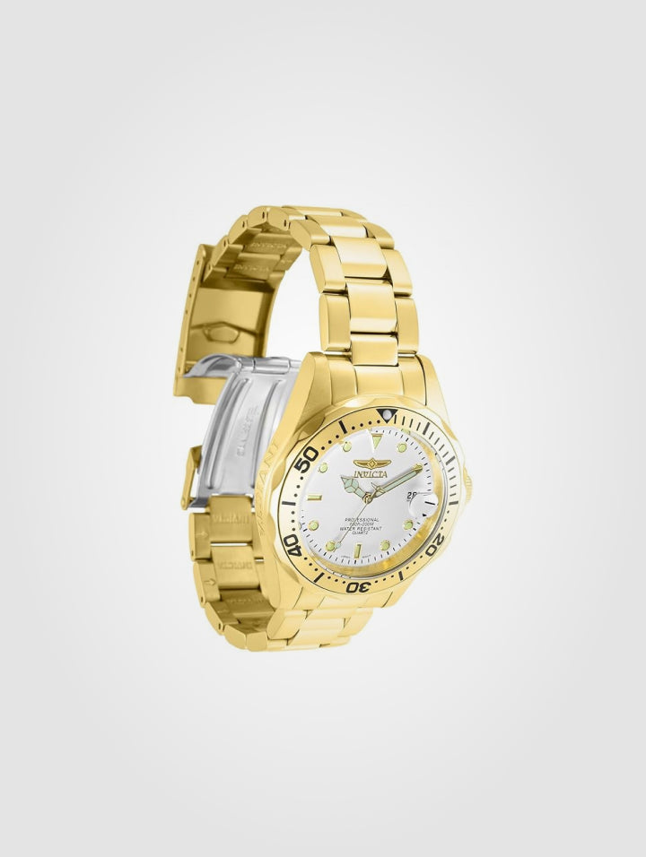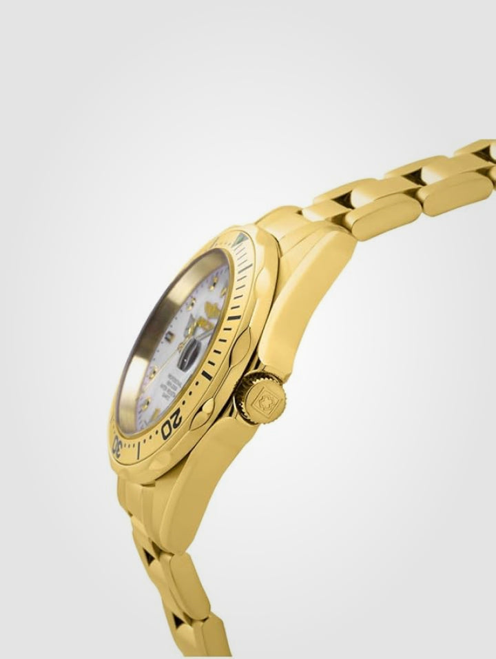 - El Invicta Pro Diver 8938 combina lujo y sofisticación en un diseño perfecto para la mujer moderna. Su elegante acabado en dorado con esfera blanca crea un contraste llamativo y refinado, ideal para quienes buscan un reloj con carácter y estilo.