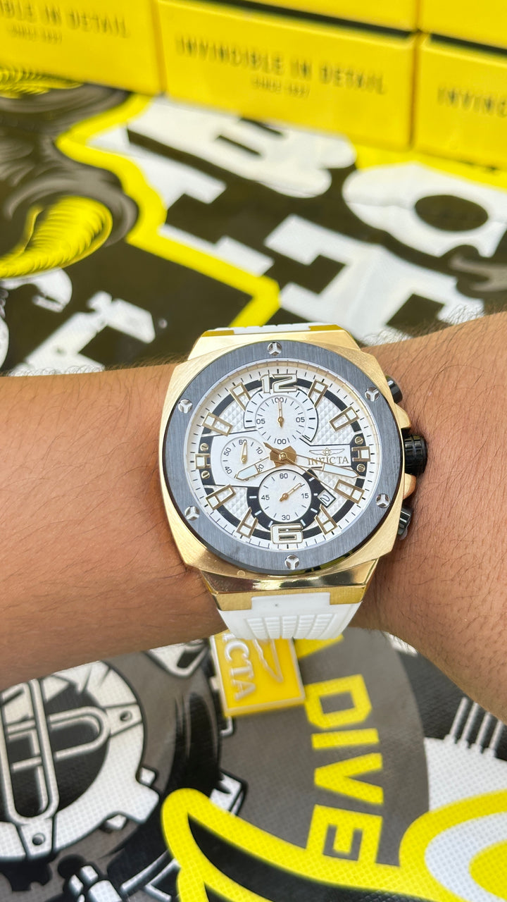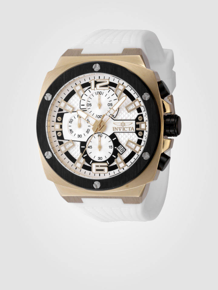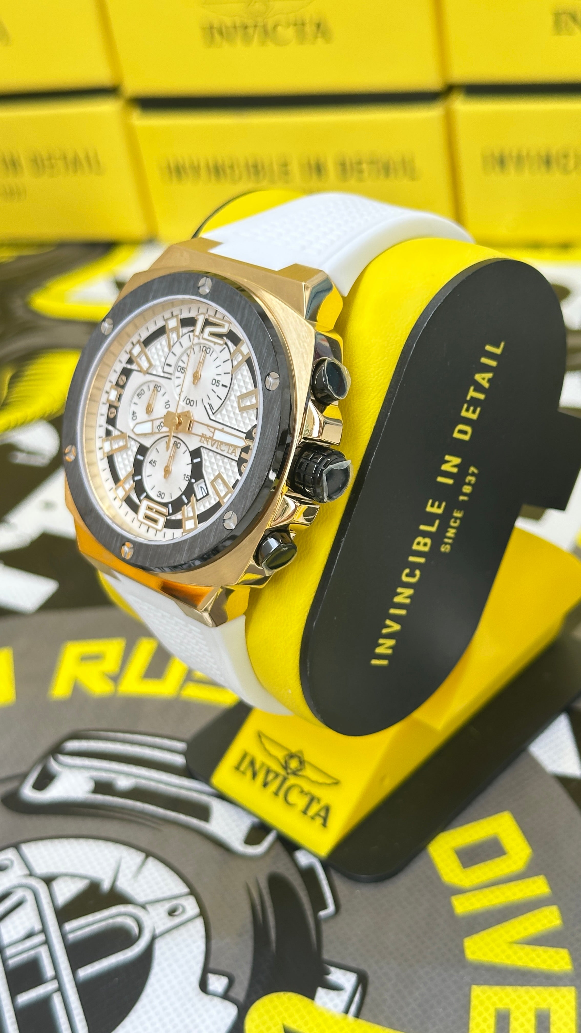 - El Invicta Racing destaca por su movimiento de cuarzo preciso, caja en negro y dorado, y esfera plateada de latón protegida por cristal mineral. Su correa blanca completa un diseño llamativo y resistente, sumergible hasta 100 metros. Ideal para un estilo deportivo con personalidad.
