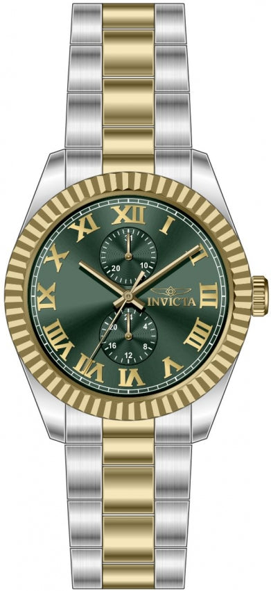 Descubre la fuerza y el carácter del Reloj Invicta Specialty Con un diseño imponente, combina una esfera verde con numeros romanos y con un pulso dorado con plateado en acero inoxidable resistente, logrando un equilibrio perfecto entre elegancia y deportividad.