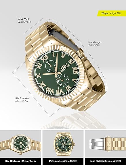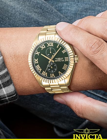 Descubre la fuerza y el carácter del Reloj Invicta Specialty Con un diseño imponente, combina una esfera verde con números romanos y con un pulso dorado con plateado en acero inoxidable resistente, logrando un equilibrio perfecto entre elegancia y deportividad.