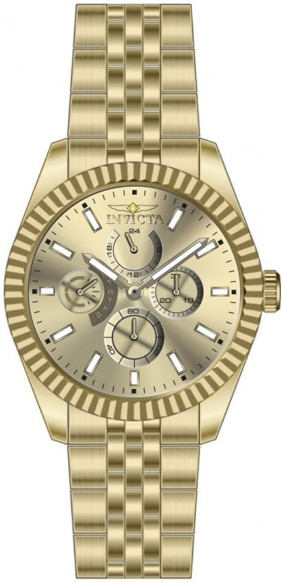 El Invicta Specialty 49542 es un reloj que destaca por su elegancia y distinción. Su construcción en acero inoxidable completamente dorado le otorga un acabado refinado y sofisticado, mientras que su esfera dorada crea una armonía perfecta que transmite lujo y estilo atemporal.