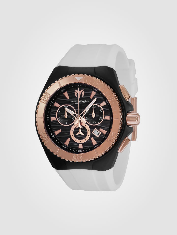 - El TechnoMarine deportivo para caballero combina un diseño audaz en blanco ,negro y con detalles en oro rosa, materiales de alta calidad y resistencia al agua, ofreciendo estilo y durabilidad para cualquier ocasión. ¡Hazlo tuyo hoy!