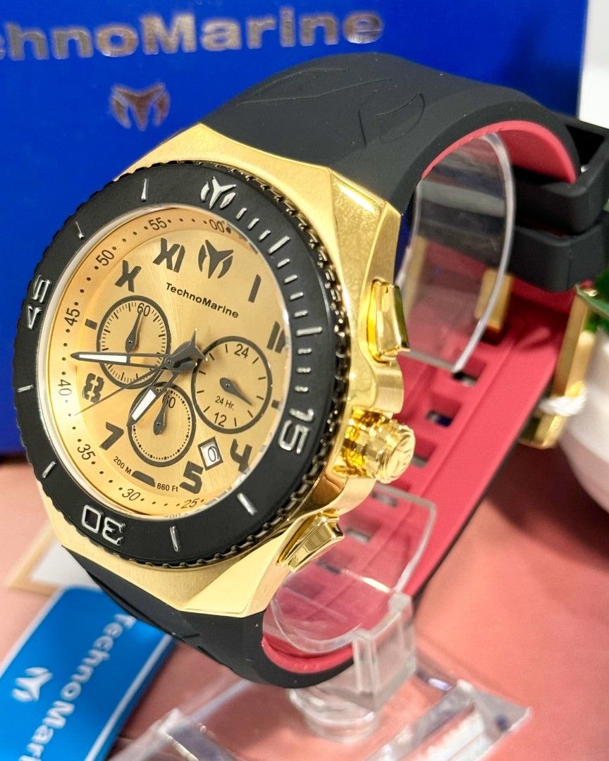 - Reloj TechnoMarine para caballero: audacia y elegancia. Con un pulso en negro y rojo, este reloj destaca por su diseño dinámico y moderno. Su caja de acero en color oro aporta un toque de sofisticación, combinando resistencia y estilo para un look único y llamativo.