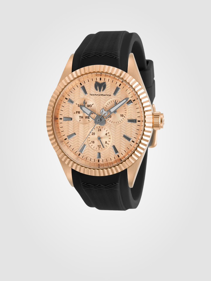 Technomarine Sea Dream TM-719026 – Un reloj elegante y resistente, diseñado para caballeros que buscan estilo y funcionalidad. Con caja de acero inoxidable en tono oro rosa de 42 mm, correa de silicona negra y movimiento japonés de cuarzo, combina lujo y durabilidad.