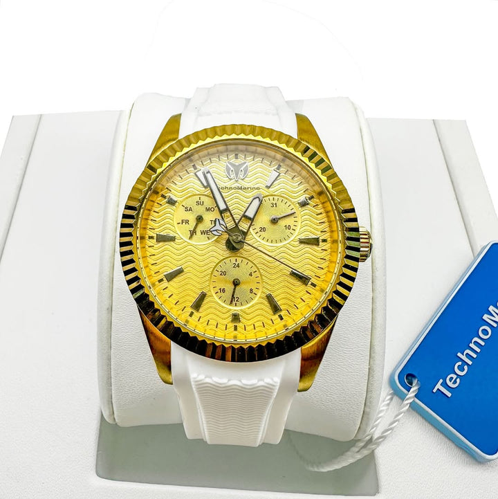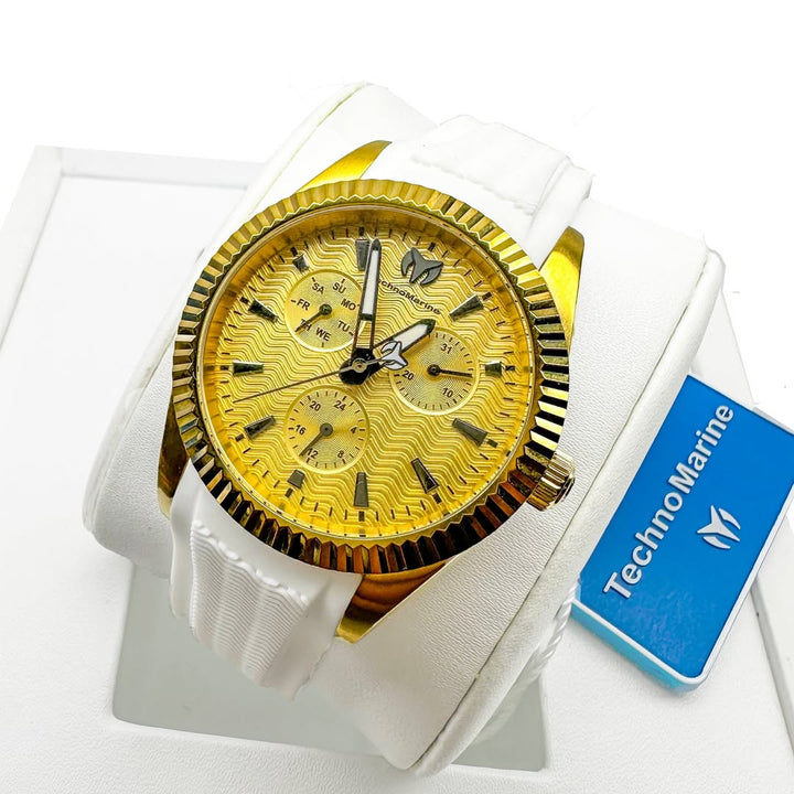 Technomarine Sea Dream TM-724003 – Un reloj elegante y resistente, diseñado para mujeres que buscan estilo y funcionalidad. Con caja de acero inoxidable en tono dorado de 38 mm, correa de silicona blanca y movimiento japonés de cuarzo, combina lujo y durabilidad.